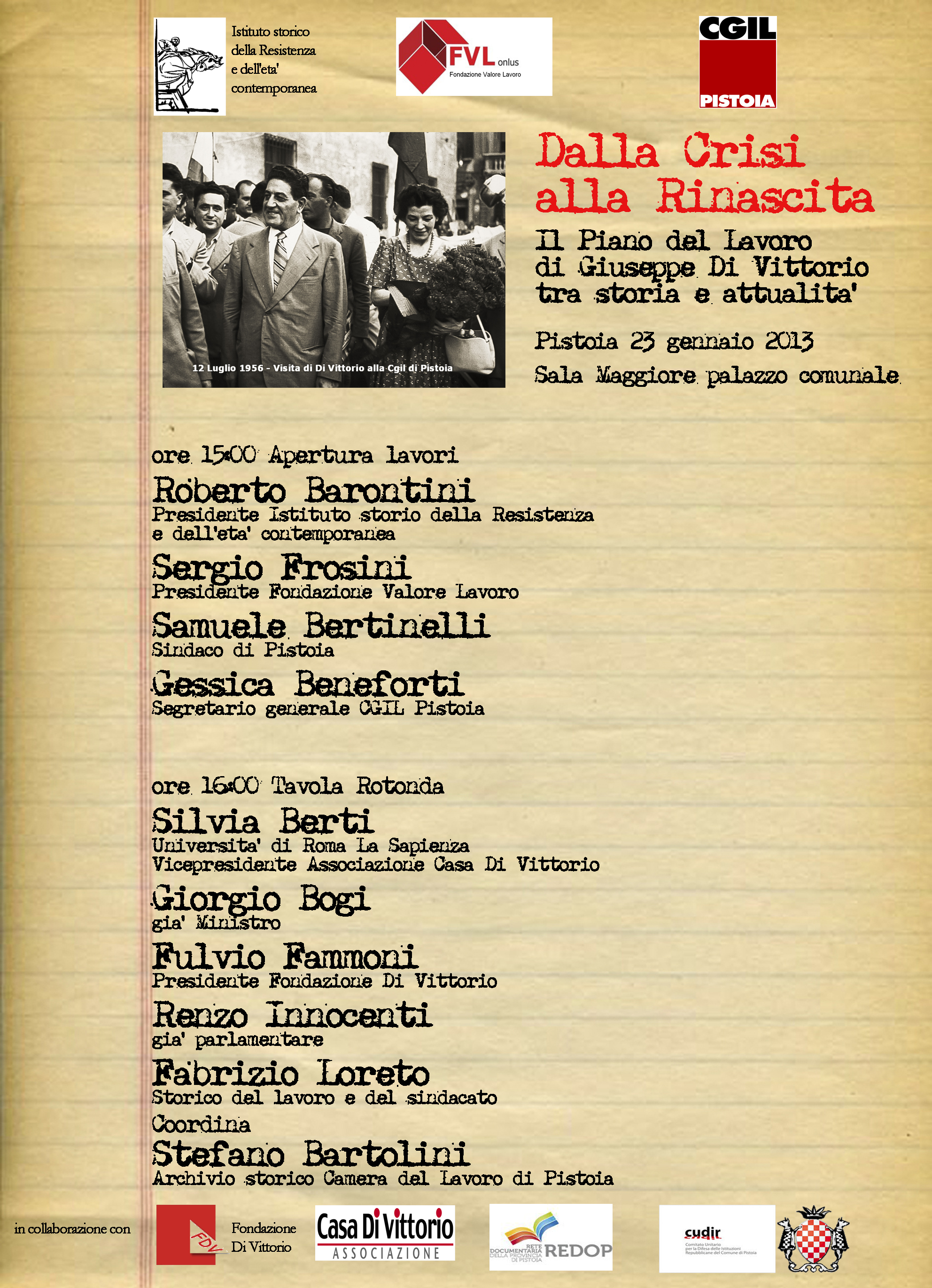 Convegno del 23 gennaio 2013 organizzato dalla CGIL di Pistoia su "Il Piano del Lavoro di Giuseppe Di Vittorio tra storia ed attualità". Locandina a colori formato A3 fronte retro.