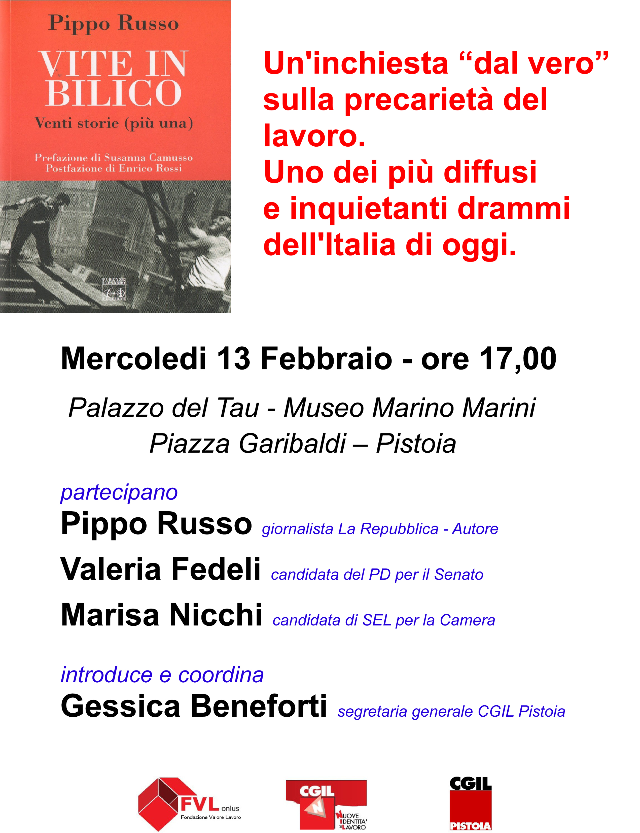 Dibattito con l'autore del libro "Vite in bilico" Pippo Russo e la partecipazione delle candidate del controsinistra alle politiche del 2013. Locandina a colori.