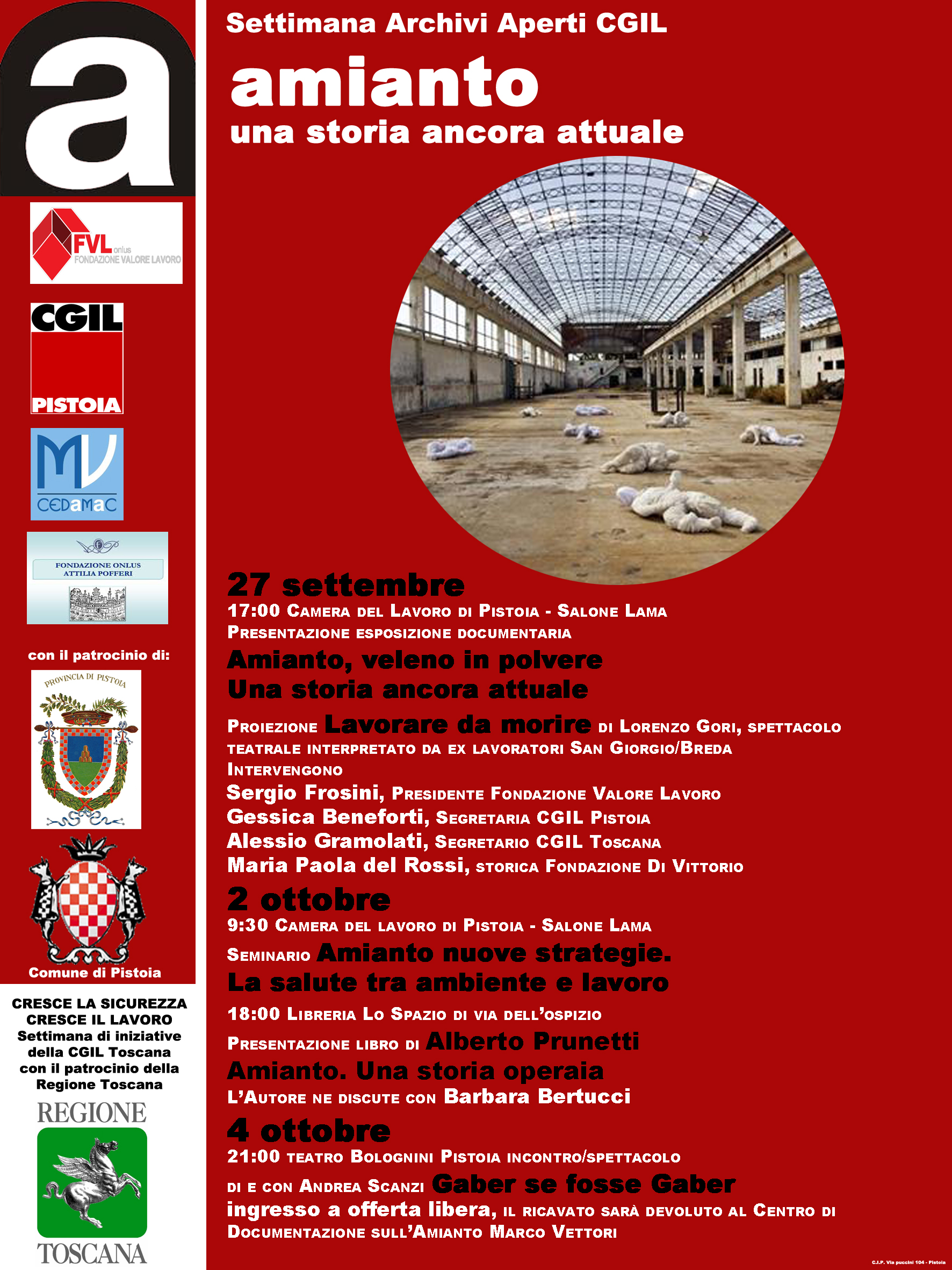 Locandina a colori formato PDF delle iniziative promosse dalla Camera del Lavoro di Pistoia e dalla Fondazione Valore Lavoro in concomitanza con la Settimana di inizative della CGIL Regionale e Camere del Lavoro Toscane sulla Sicurezza del Lavoro.